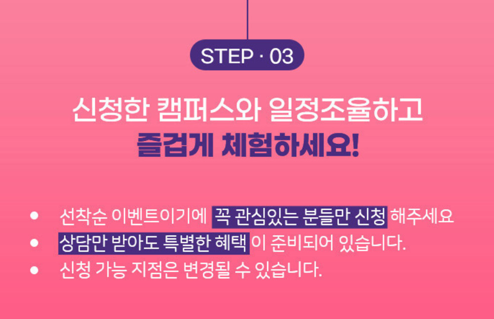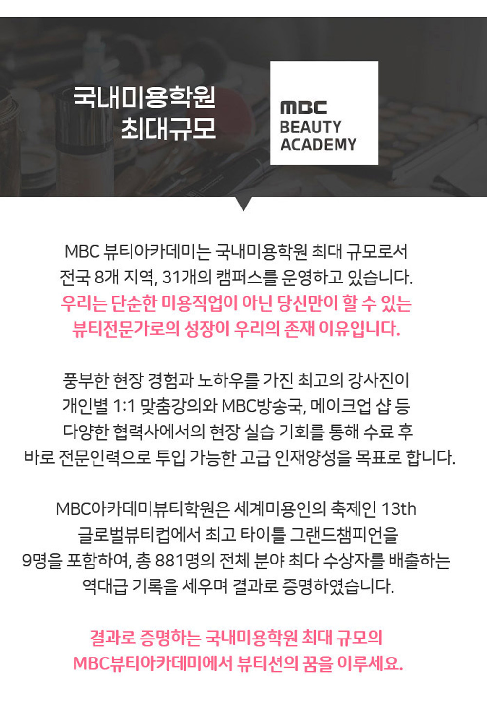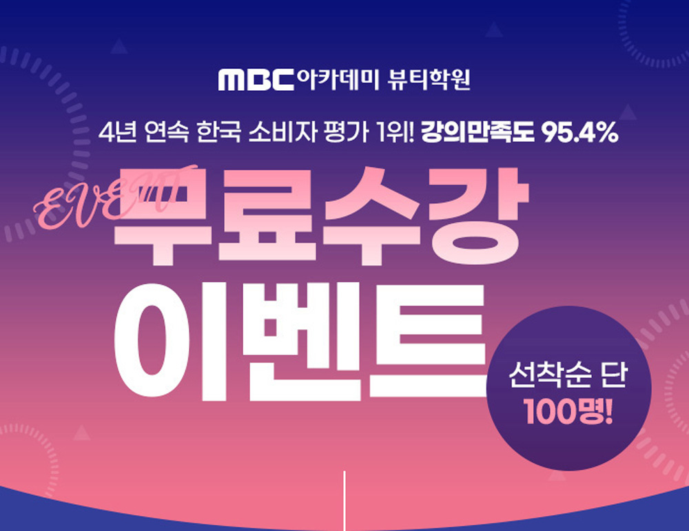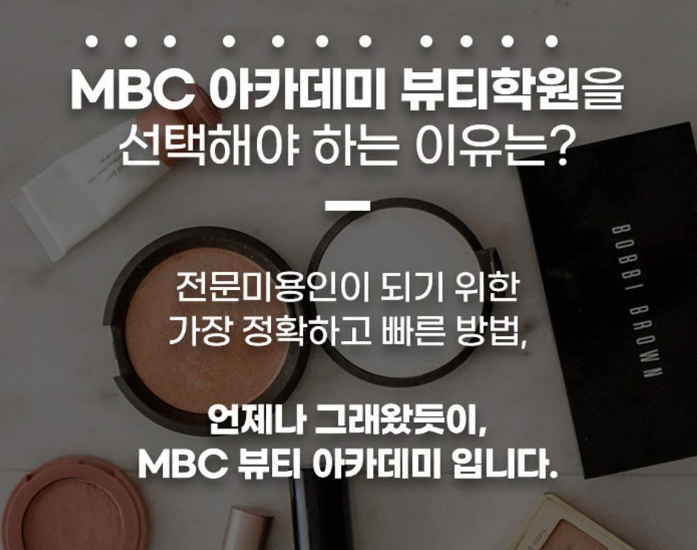 전문 미용인이 되기 위한 정확하고 빠른 방법! MBC 뷰티 아카데미입니다. 국내 뷰티 전문인을 양성하도록 도와드립니다! 원하는 지점을 선택하셔서 즐겁게 체험해보세요! 선착순 이벤트이기 때문에, 체험 수업 이벤트는 조기종료될 수 있습니다.